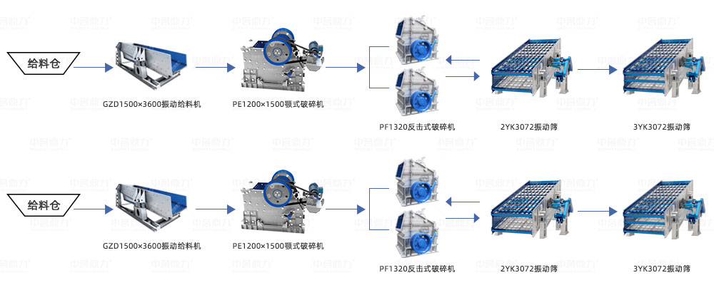 設備搭配方案:GZD1500×3600給料機*2、PE1200×1500顎破機*2、PF1320反擊破*4臺、2YK3072振動篩*2、3YK3072振動篩*2、皮帶機。