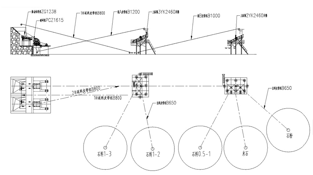 流程描述:大塊石料由DLZG1238振動給料機均勻、連續的輸送到DLPCZ1615重錘破進行粗碎,粗碎后的混合料由1.2米的混料輸送帶送到一臺3YK2460振動篩進行篩分,篩分出1-3和1-2兩種成品石子,大于31.5mm的由一條800的返料輸送帶送回到破碎機再次破碎,小于1-2的石料輸送到二道篩再次篩分,篩分出0.5-1石子、米石和石粉三種成品料。