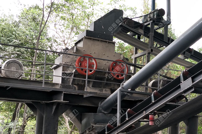方案二:適合石灰石、青石、煤矸石等中低硬度或者脆性物料的制砂作業(yè),重錘破可將大塊物料直接破碎到30mm以下用來(lái)制砂,設(shè)備投資成本低。