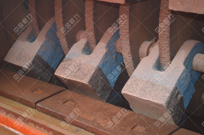 2、在不可破異物通過破碎腔或因某種原因機器載時,錘式破碎機彈簧保險系統實現保險,排礦石增大。異物從機腔排出,如異物卡在排礦口使用清腔系統,使排礦繼續增大,使異物排出破碎腔。錘式破碎機在彈簧的作用下,排礦口自動復位,設備恢復正常工作;