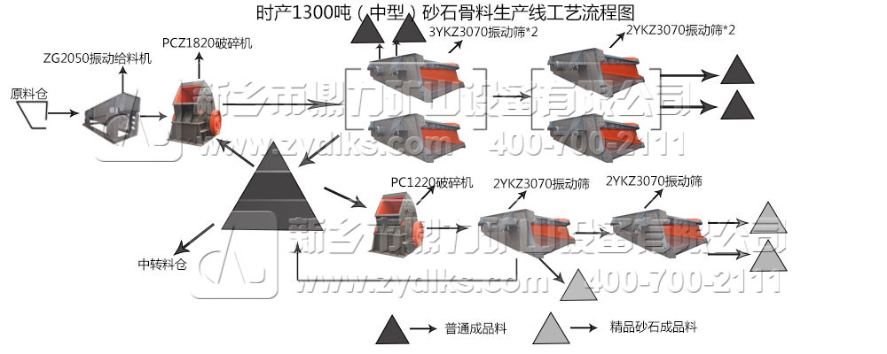 從流程工藝圖可以看到。物料從原料倉進入振動給料,勻速運動的物料被輸送至破碎機進行破碎,一部分破碎物料經(jīng)過振動篩篩分出符合粒度物料,成為普通的成品砂石料。另一部分破碎物料被輸送至中轉(zhuǎn)料倉,可用于進行加工普通成品料的原材料,也可經(jīng)過整形式破碎機破碎,獲得品質(zhì)比較高的砂石骨料。