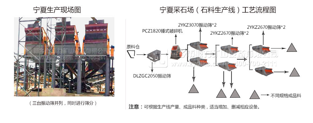 從生產(chǎn)現(xiàn)場圖可以看到,三臺振動篩并駕齊驅(qū),同時進(jìn)行篩分,可以快速進(jìn)行破碎物料粒度的篩分,從而形成短時間、率、產(chǎn)量高的大中型砂石骨料生產(chǎn)線。