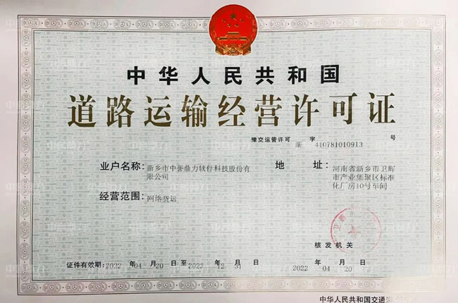 近日,中譽鼎力軟件科技股份有限公司順利取得道路運輸經營許可證,經營范圍包括道路普通貨物運輸和網絡貨運等,為公司自主研發的“鼎力好運”網絡貨運平臺提供資質支持。