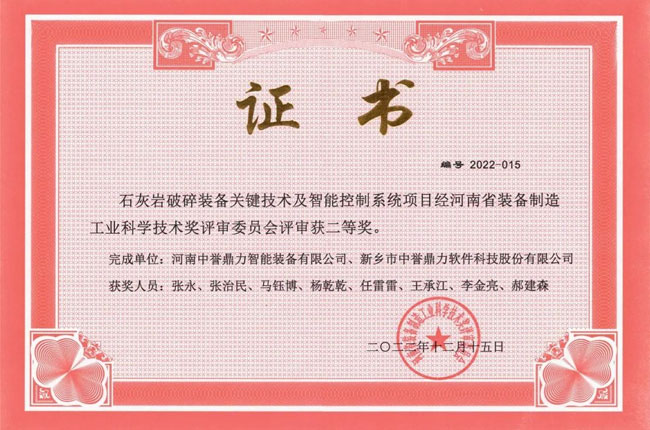 根據河南省裝備制造業協會、河南省高新技術企業協會《關于開展2022年度河南省裝備制造業科學技術獎工作的通知》(豫裝制協【2022】04號)文件要求,經河南省裝備制造工業科學技術獎評審委員會評審,河南中譽鼎力智能裝備有限公司與新鄉市中譽鼎力軟件科技股份有限公司共同研發的石灰巖破碎裝備關鍵技術及智能控制系統項目獲河南省裝備制造業科學技術獎二等獎