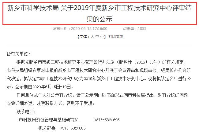 近日,新鄉市科學技術局發布《關于2019年度新鄉市工程技術研究評審結果的公示》。根據《新鄉市市級工程技術研究管理暫行辦法》(新科計〔2016〕33號)有關規定,科學技術局組織開展了“2019年度新鄉市工程技術研究”申報工作。