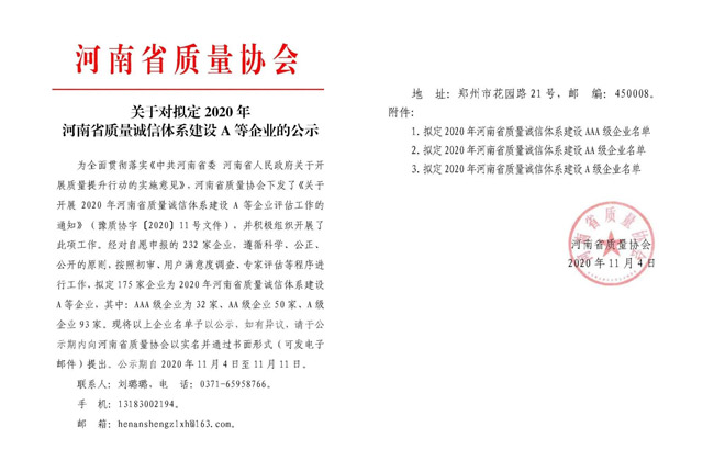 為面貫徹落實《中共河南省委河南省人民關于開展質量提升行動的實施意見》,河南省質量協會下發了《關于開展2020年河南省質量誠信體系建設A等企業評估工作的通知》(豫質協字[2020]11號文件),中譽鼎力軟件科技股份有限公司積參評。公司自成立以來,堅持“一言九鼎誠信天下”的經營理念,秉持對客戶負責的態度,以工匠精雕鑄鼎力品質,不斷開拓公司業務,樹立了守法履約的良好企業形象和客戶口碑,入選“2020年河南省質量誠信體系建設AA級企業”名單。