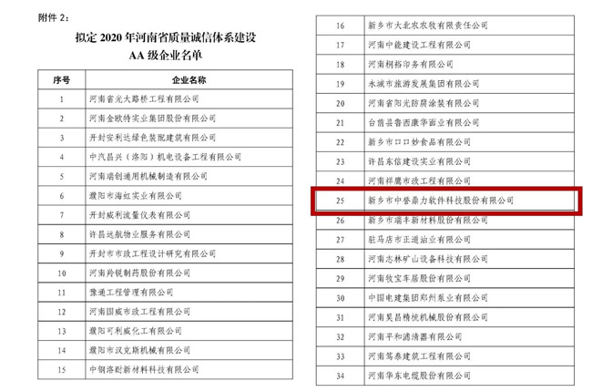 近日,新鄉市中譽鼎力軟件科技股份有限公司通過初審、用戶滿意度調查、評估等程序,成功入選“2020年河南省質量誠信體系建設AA級企業”名單。