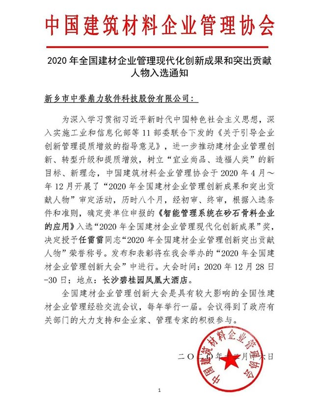 新鄉市中譽鼎力軟件科技股份有限公司作為礦山智能管理技術企業應邀參會,并憑借“智能管理系統在砂石骨料企業的應用”獲評“2019-2020年度建材企業管理現代化創新成果”典型案例獎;公司常務副總經理任雷雷被授予“2019-2020年度建材企業管理創新突出貢獻人物”稱號!