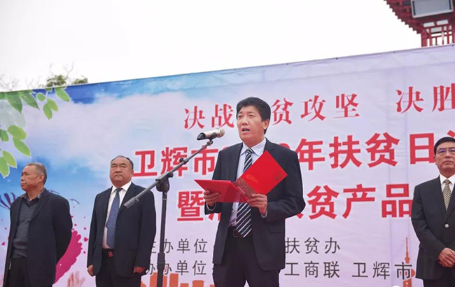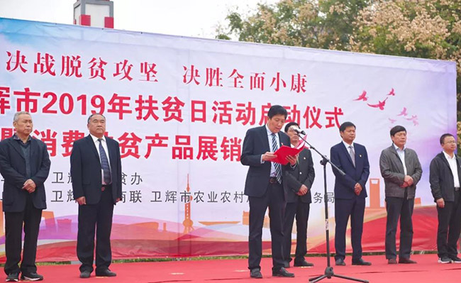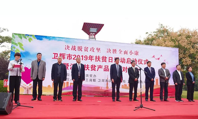 2019年10月17日是我第六個(gè)扶貧日。為營(yíng)造人人關(guān)心扶貧、人人支持扶貧、人人參與扶貧的社會(huì)氛圍,上午,由衛(wèi)輝市扶貧辦主辦,衛(wèi)輝市工商聯(lián)、衛(wèi)輝市農(nóng)業(yè)農(nóng)村局、衛(wèi)輝市商務(wù)局協(xié)辦的衛(wèi)輝市2019年扶貧日活動(dòng)啟動(dòng)儀式暨消費(fèi)扶貧產(chǎn)品展銷(xiāo)對(duì)接會(huì)在衛(wèi)輝市廣場(chǎng)隆重舉行,衛(wèi)輝市委書(shū)記梁常運(yùn)、市政協(xié)主席田貞等四大班子導(dǎo)及衛(wèi)輝市企業(yè)代表出席會(huì)議。
