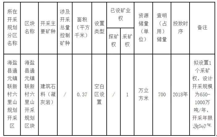 一、新增“海鹽縣通元鎮聯新村六里山建筑用石料規劃開采區(KC1)”