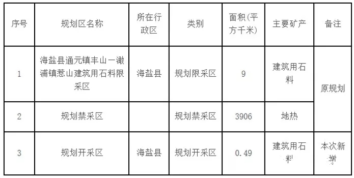 擬在規劃禁采區(CJ330400001)內新劃定規劃開采區一個,并設置開采規劃區塊1個,區塊內設置“海鹽縣通元鎮聯新村六里山普通建筑石料礦”采礦權1宗。