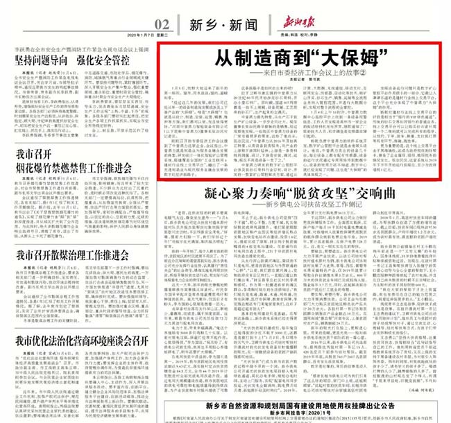 1月7日,《新鄉(xiāng)日報》在二版頭題位置刊發(fā)了《從制造商到“大保姆”》一文,報道了中譽鼎力從單一的礦山設(shè)備制造商發(fā)展成涉及建材域上下游產(chǎn)業(yè)的“大保姆”的轉(zhuǎn)型歷程。