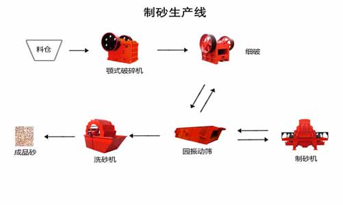 一般制砂生產(chǎn)線由破碎制砂設(shè)備和輔助設(shè)備共同構(gòu)成,其中破碎制砂設(shè)備根據(jù)流程依次為:顎式破碎機(jī)(粗破)、圓錐式破碎機(jī)/反擊式破碎機(jī)(細(xì)破)、制砂機(jī) ,分三個(gè)破碎等級(jí)對物料進(jìn)行加工處理。輔助設(shè)備一般有:給料倉、振動(dòng)給料機(jī)、傳輸皮帶機(jī)、振動(dòng)篩、洗砂機(jī)。