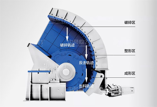 在第三反擊區的可調節反擊板上留出空隙,讓直徑小于空隙的物料直接自然流出,避免再次破碎,提升產能的同時,大大減少產粉率,是在物料合適的情況下是替代傳統反擊式破碎機的可選產品。