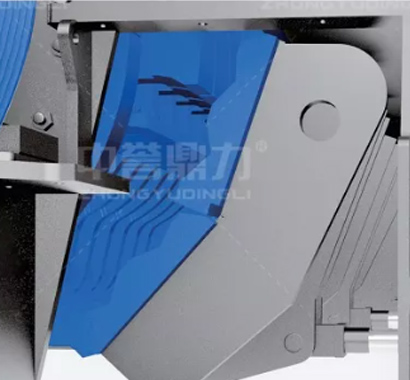 上面一個反擊區的反擊板花紋是波浪下行式,它的反擊軌跡是轉子的兩路錘頭之間,好處是錘頭對物料起破碎作用,該反擊區起到對物料進行整形,從而通過反擊軌跡到兩路錘頭之間加大了破碎率,反擊區是反擊板的花紋我們采用菱形反擊,他的運動軌跡是錘頭的下方,加快了物料下行的速度,縮短了物料在機腔內的停留時間,同時也對物料進行了反擊整形,第三反擊區我們采用倒三角反擊,自流,可調間距的反擊結構