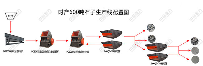 時產600噸石子生產線工藝流程:石灰石經料倉由ZG1550振動給料機送到重型錘式破碎機PCZ1615進行初步破碎,破碎后的物料被輸送到一組3YKZ2470并篩進行篩分,篩分三種成品料,成品料直接送到成品料倉,不滿足成品料粒度要求的,被返回整形破碎機PC1216進行再次加工,其余物料被送到下一組2YKQ2470并篩進行篩分,篩分出三種石子成品,分別送到成品料倉中。