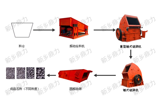 石子生產線主要分為給料、破碎、篩分三個環節,其主要設備有振動給料機、破碎機、整形機及振動篩。大塊石頭從料倉進入給料機之后,物料再由振動給料機均勻的喂入破碎機之后進行破碎,破碎之后的物料通過皮帶輸送機進入整形機內進行整形,后進行篩分,直到篩出符合要求的成品料即可,不符合要求的需要再次進入破碎機重新破碎。詳細的流程和設備可以參考下圖: