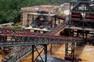 從石子破碎生產線的高出能夠很清楚的看到產線全景。可以看到該生產線采用2級破碎的工序,之后由振動篩篩分后物料分別入庫。并且由于產量大的原因料倉建設兩排,以便拉料車進出。