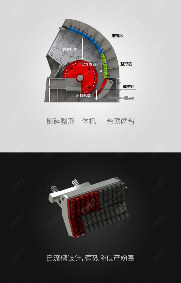 1720反擊破內部由渦旋破碎腔和P、S、T三段破碎區,所以又叫PFQ1720渦旋反擊式破碎機,屬于該系列中一款較大型號,每小時產量可達到將近600噸,抗壓強度250MPa以下的礦石均可破碎,配套2臺280kw大小的電機,外形尺寸比較大,長寬高分別為5540*3830*4600mm,破碎腔容積大,單位時間產量高,是一款節能、生產效率高、成品料粒形好的反擊式破碎機。